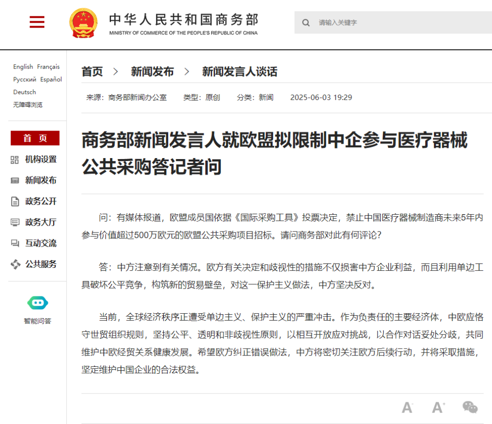 针对有媒体报道欧盟成员国依据《国际采购工具》投票决定禁止中国医疗器械制造商未来5年内参与价值超500万欧元欧盟公共采购项目招标一事,商务部新闻发言人作出回应:中方注意到相关情况,认为欧方有关决定和歧视性措施损害中方企业利益,利用单边工具破坏公平竞争、构筑贸易壁垒,中方坚决反对这种保护主义做法。