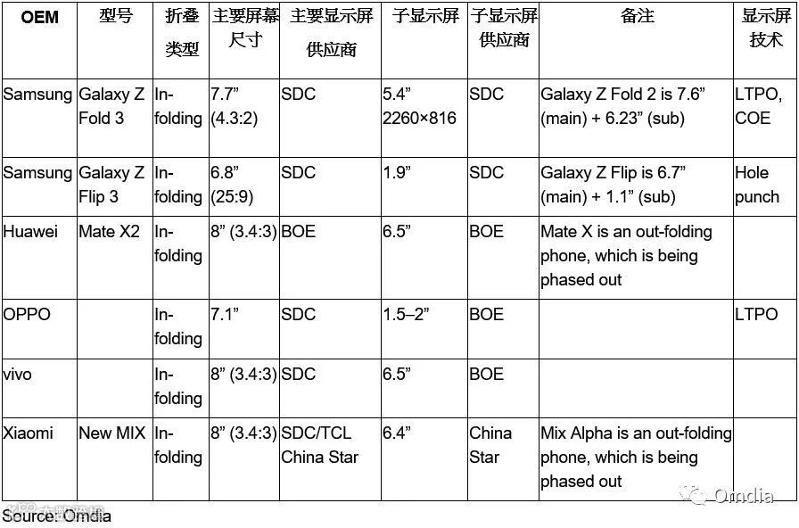 其还制作了一份表格,对这几家的折叠屏产品内外屏的规格及供应商等进行了汇总。值得注意的是,这六款折叠屏全都是内折方案,OPPO、vivo的量产折叠屏也是头一回见,其中OPPO展开屏在7.1英寸左右,折叠后小屏在2英寸左右,似乎是和Flip一样的上下内折方案,还支持LTPO技术;而vivo折叠屏展开屏是8英寸左右,折叠后外屏6.5英寸左右。
