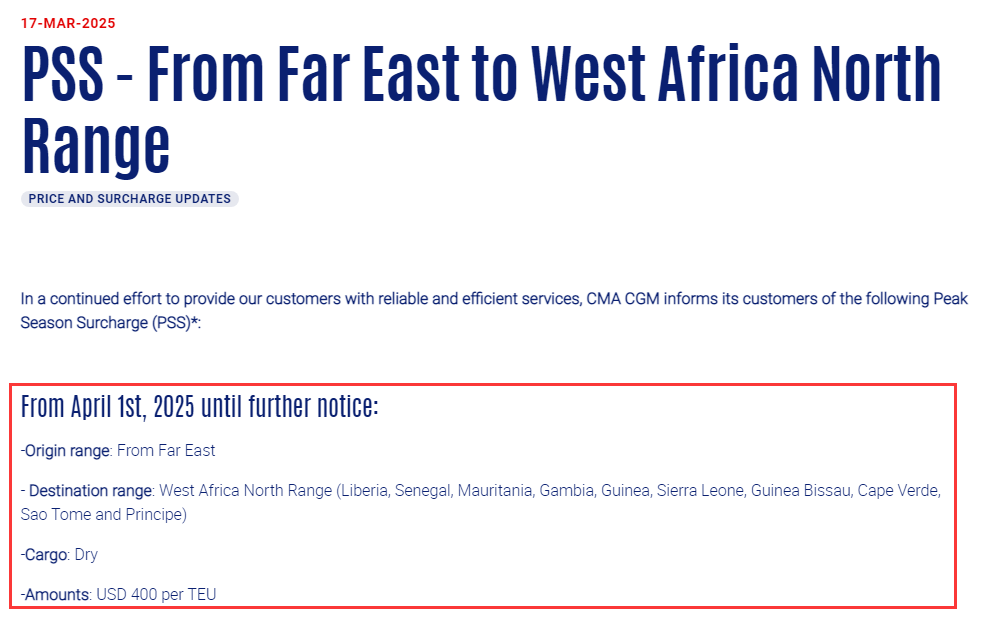 自2025年4月1日起,直至另行通知。来自远东至西非北部(利比里亚、塞内加尔、毛里塔尼亚、冈比亚、几内亚、塞拉利昂、比绍、佛得角、托姆和普林西比)的干货货物,征收400美金/TEU的附加费PSS。
