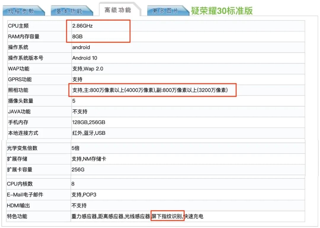 配置方面,荣耀30系列这三款新机 全系6.57英寸2340*1080分辨率的OLED屏+屏幕指纹,搭载主频为2.86GHz的八核处理器,即麒麟990 5G,支持双模5G多频段;均支持5倍光学变焦,电池容量额定值3900mAh,典型值预计4000mAh,40W快充。