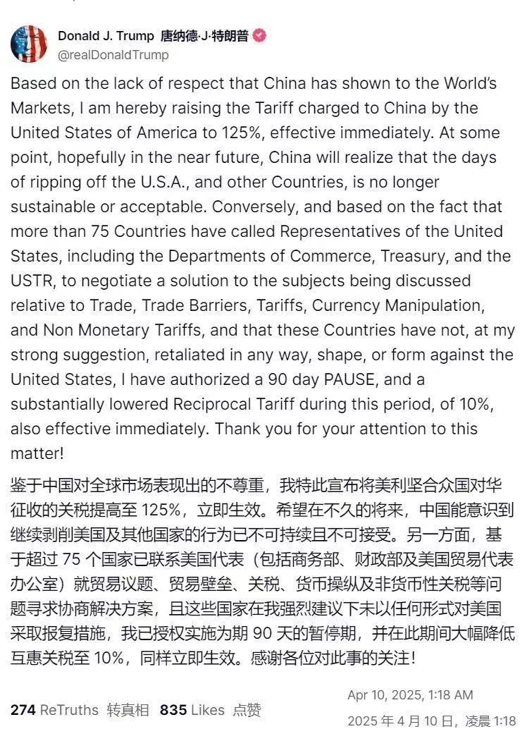 美东当地时间4月9日下午两点,特朗普在社交平台Truth Social上发文:他将对从中国进口的商品征收的关税提高到 125%,“立即生效” !