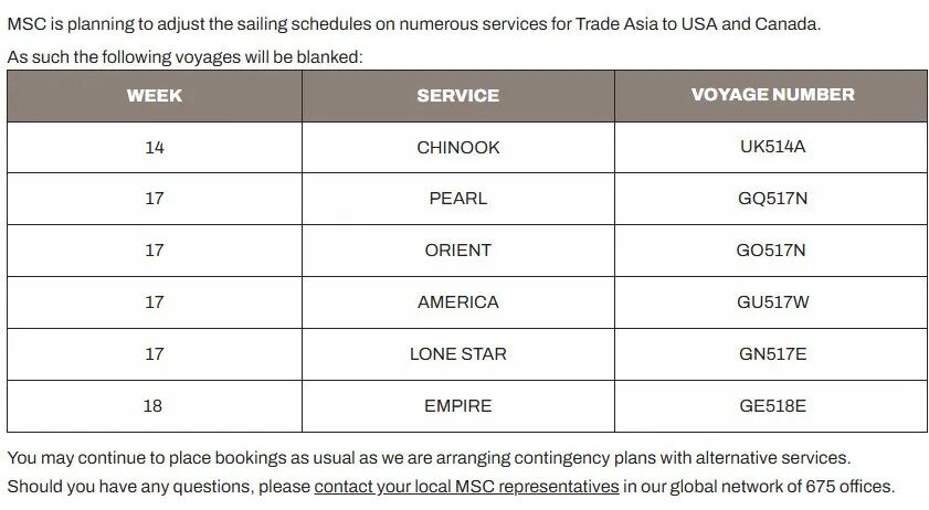 面对运价持续走低的趋势,全球航运巨头地中海航运(MSC)已采取行动。该公司日前发布通知,宣布取消跨太平洋航线6个航次。具体包括: