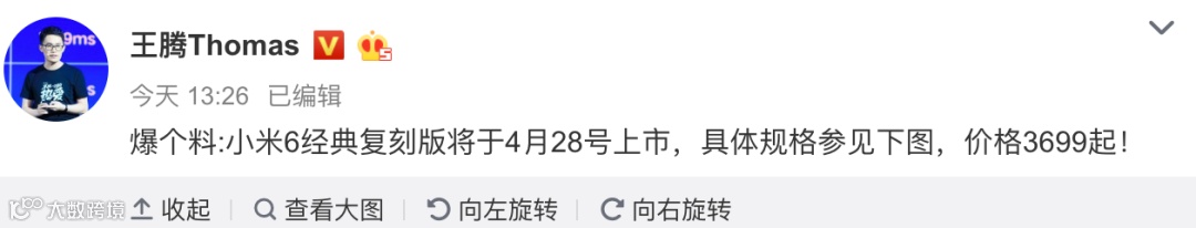其爆料称:小米6经典复刻全面屏版将于4月28日上市,采用居中挖孔+竖排三摄,5.99英寸2K分辨率90Hz刷新率,108MP主摄,骁龙865+X55支持双模5G多频段,4070mAh,30W无线充,65W有线充,双扬声器,X轴横向线性马达等等,3699元起售。