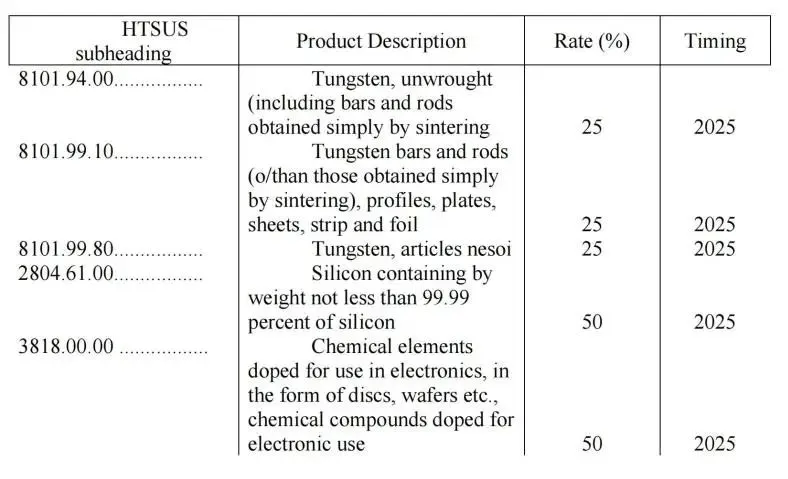 近日,美国贸易代表办公室宣布,将把从中国进口的太阳能晶圆和多晶硅(制造太阳能电池板的必要组件)的关税从25%提高至50%;而用于制造电子产品和半导体的某些钨制品,将被征收25%的新关税。