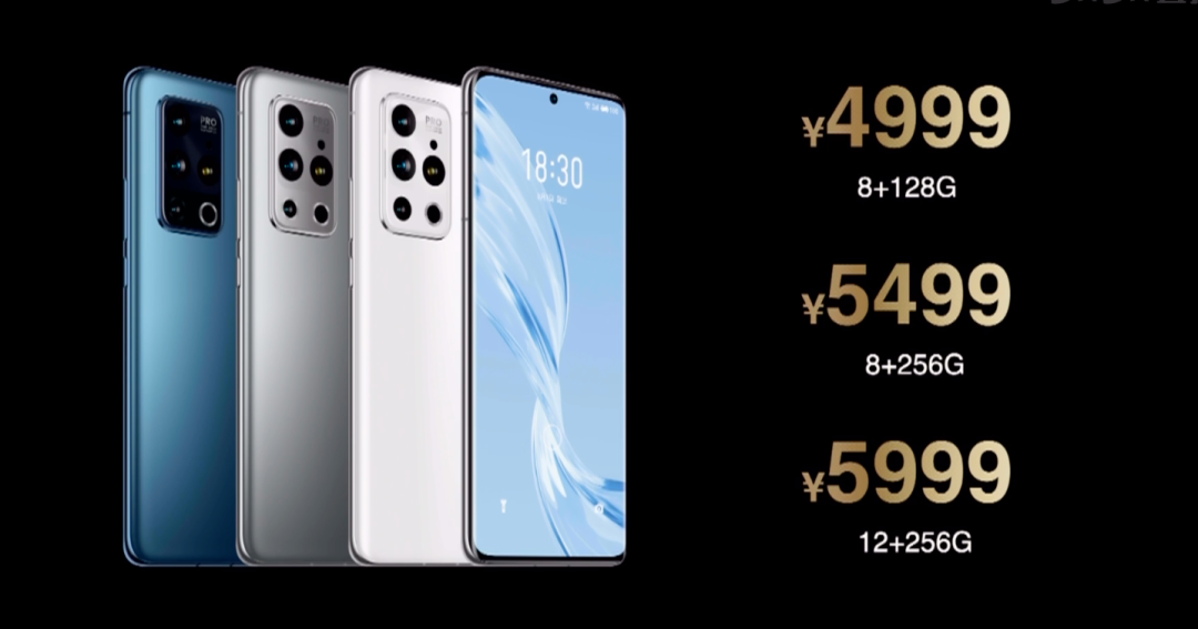 后背部分,魅族18 Pro提供飞雪流光(白)、银河秘境(银)、苍穹浩瀚(蓝)3个配色,全系AG玻璃后盖,机身三围162.5*73*厚8.1mm,重189g。