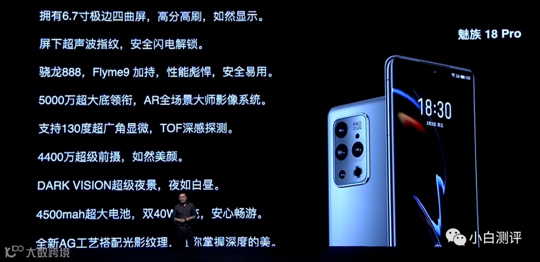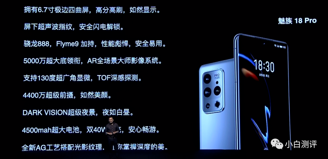 核心配置上,魅族18 Pro搭载高通骁龙888处理器,支持双模5G、WiFi6E,LPDDR5+UFS 3.1,4500mAh电池+支持40W有线充电/40W无线充电,立体双扬声器,横向线性马达X轴,全功能NFC支持小鹏汽车蓝牙钥匙 等等。