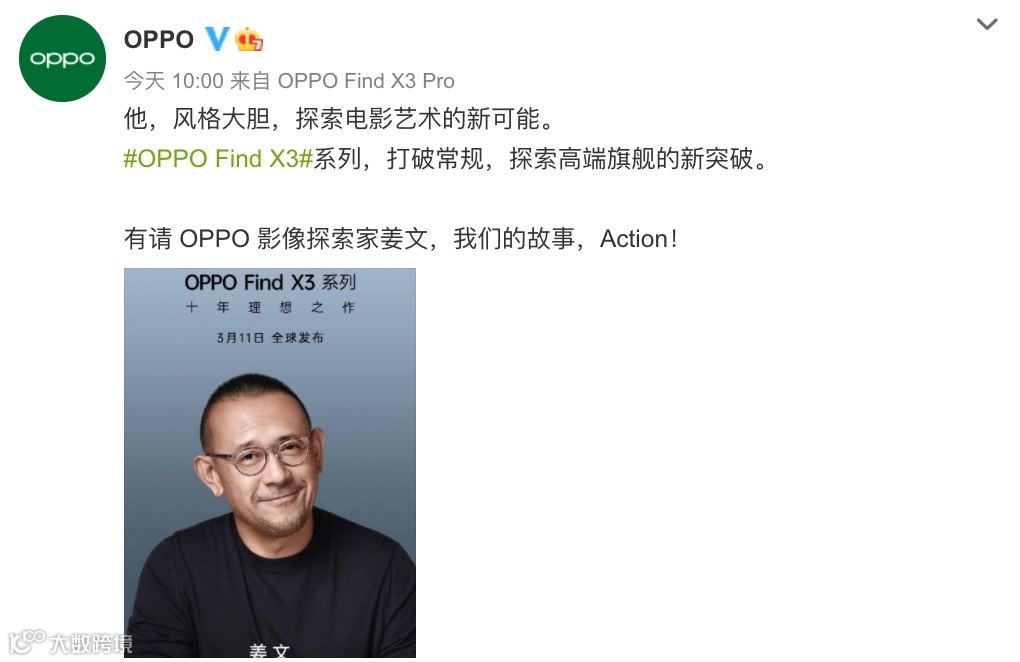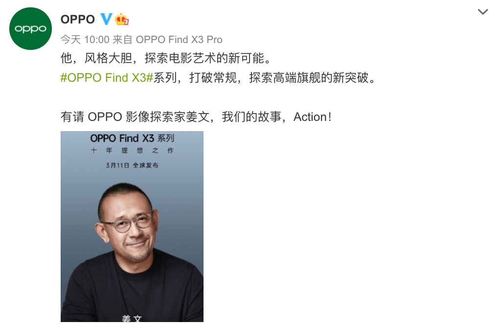 首先是OPPO官博的预热,其并没有预热更多产品相关的信息,而是宣布了一位「影像探索家」,姑且也可以理解为是Find X3系列的形象代言人,用其一句经典的电影台词来形容“什么TMD叫惊喜”,姜文代言OPPO就算是一个惊喜。