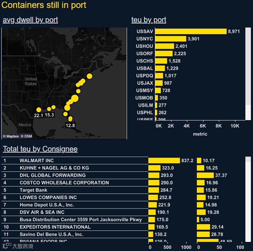 根据维兹昂API的数据显示,受影响最大的公司是沃尔玛,在东海岸和海湾沿岸的港口都有集装箱,在港口有837.2TEU,平均停留时间超过10天。
