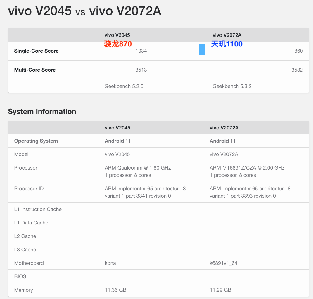 与此同时,vivo S9也现身Geekbench 5跑分库,其单核跑分860,多核跑分3532分;对比vivo尚未发布的骁龙870新机单多核跑分1034/3513,天玑1100多核表现稍好一点点,也可以说持平吧,单核则不如骁龙870。