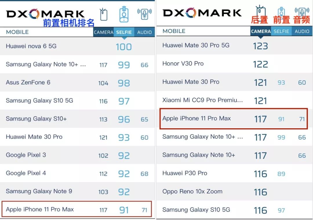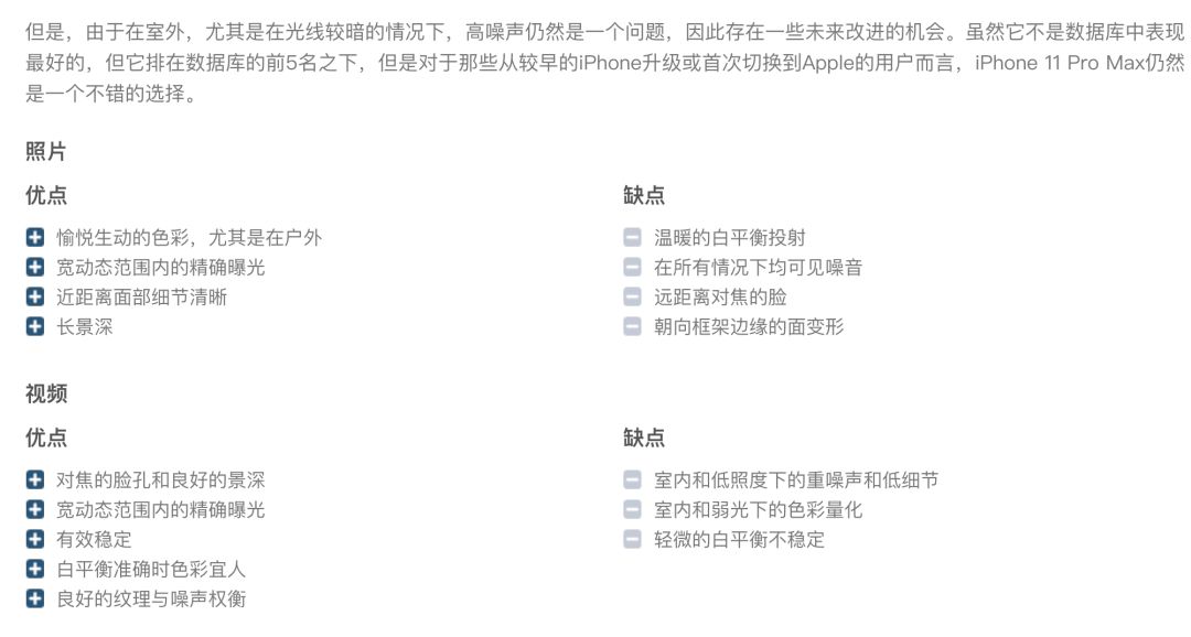 DxOMark给的评语是改用广角镜头和4K视频捕捉功能,使iPhone 11 Pro Max前置摄像头比XS Max升级不少,能够为静态图像和视频提供出色的效果,具有良好的曝光,宽广的动态范围、令人愉悦的显色性、出色的聚焦等。但室外,尤其是光线较暗情况下,高噪等是问题。