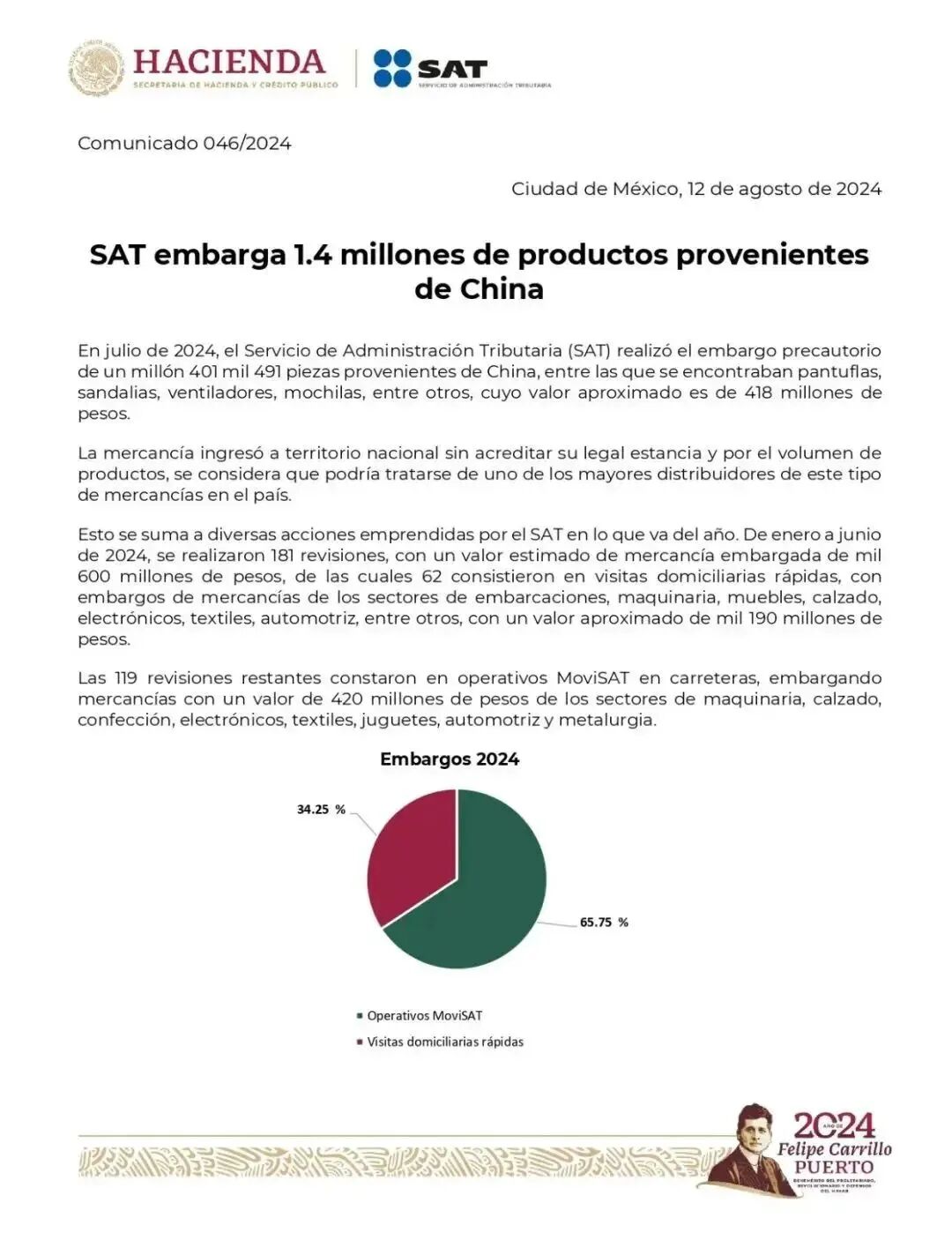近日,墨西哥国家税务管理局(SAT)发布报告,宣布对一批总价值约4.18亿比索的中国商品实施了预防性扣押措施。