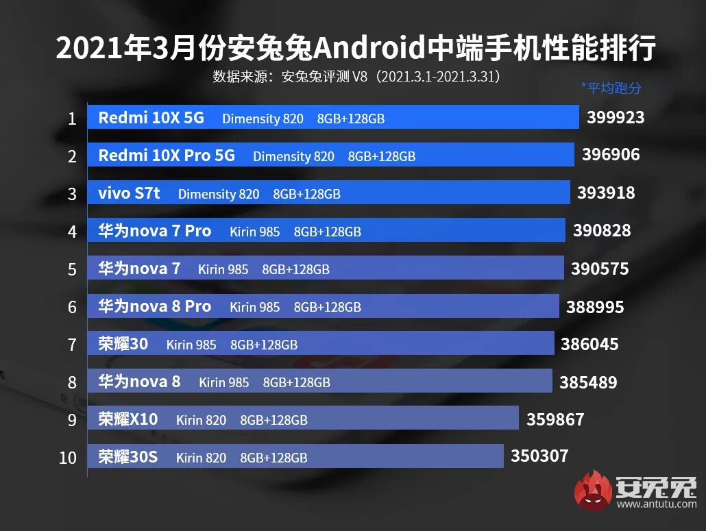 TOP 10基本没啥变化,TOP 3全是天玑820机型,随后则是麒麟985机型,随着越来越多天玑820机型的登场,预计之后这份榜单也会出现更多820机型的名字。