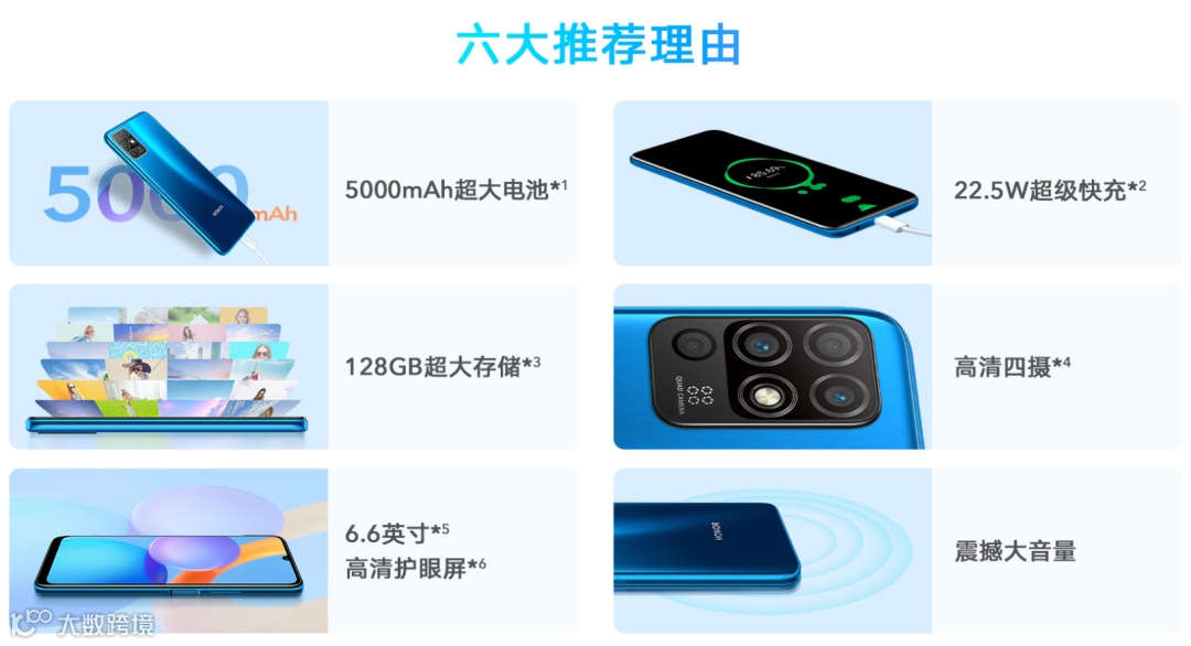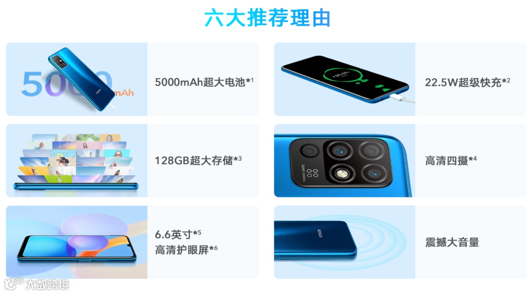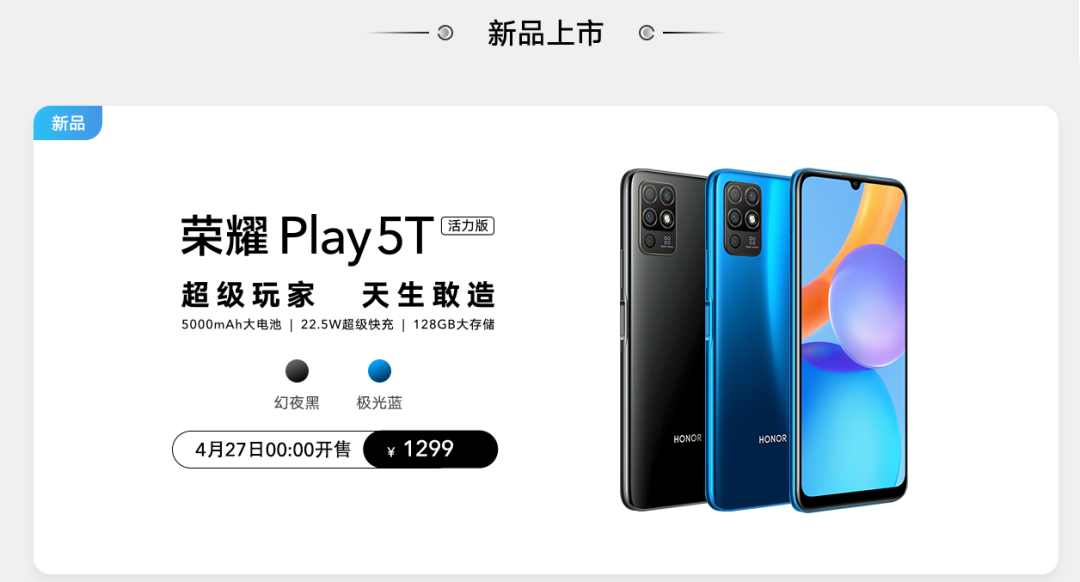 而荣耀Play 5T活力版 6+128GB售价1299元,主要参数:6.6英寸1600*720P分辨率LCD水滴屏+侧边指纹,前置800万像素,后置四摄1300万像素+500万+200万+200万,搭载12nm工艺制程的联发科MT6765处理器(4*A53@ 2.3GHz+4*A53@ 1.8GHz),5000mAh大电池+22.5W充电,type-C充电口,保留3.5mm耳机,最大支持512GB拓展。