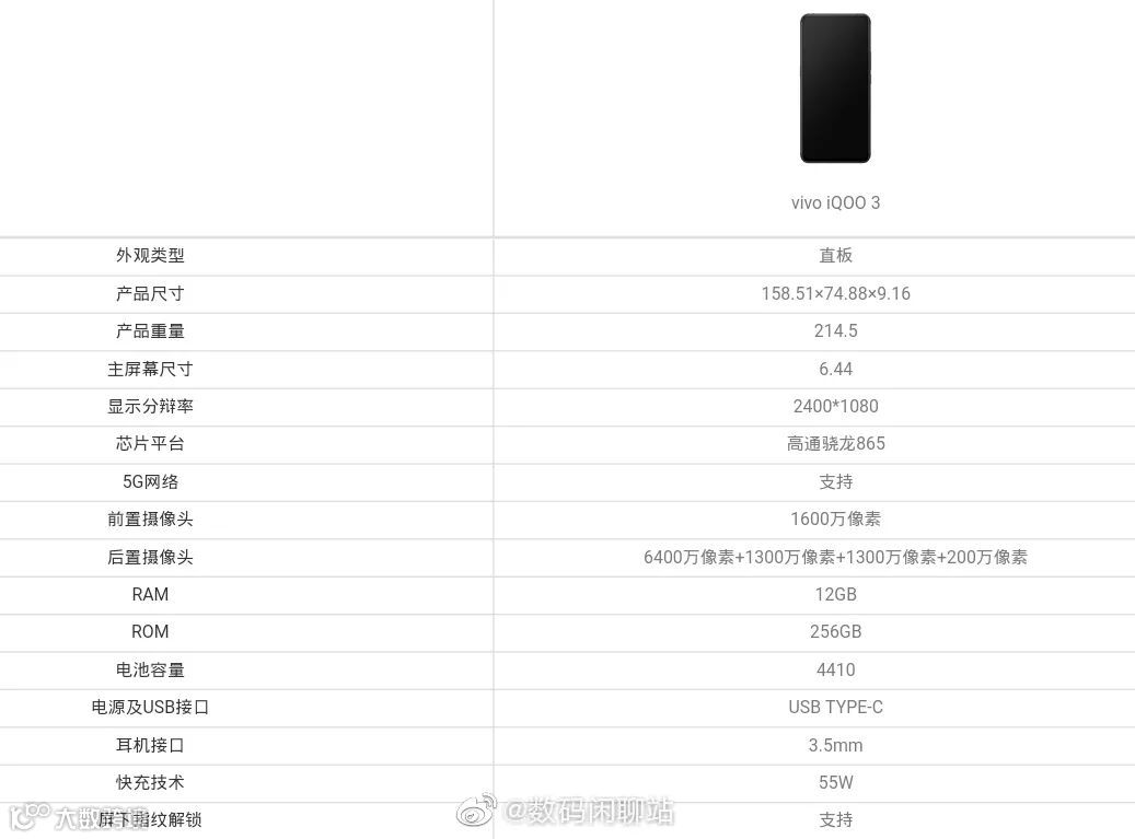 而关于iQOO 3 5G的其他消息,据爆料,iQOO 3将采用6.44英寸2400*1080分辨率OLED屏,屏幕指纹,机身三围158.51*74.88*9.16mm,重214.5g,前置16MP,后置四摄64MP+13MP+13MP+2MP,提供12+256GB储存规格,4410mAh,保留3.5mm耳机孔。