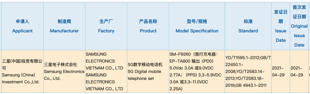 如上图所见,型号为SM-F9260的三星5G新机于4月29日获得3C认证, 配备熟悉的25W充电器,不出意外的话这款新机对应的就是三星Galaxy Z Fold 3。