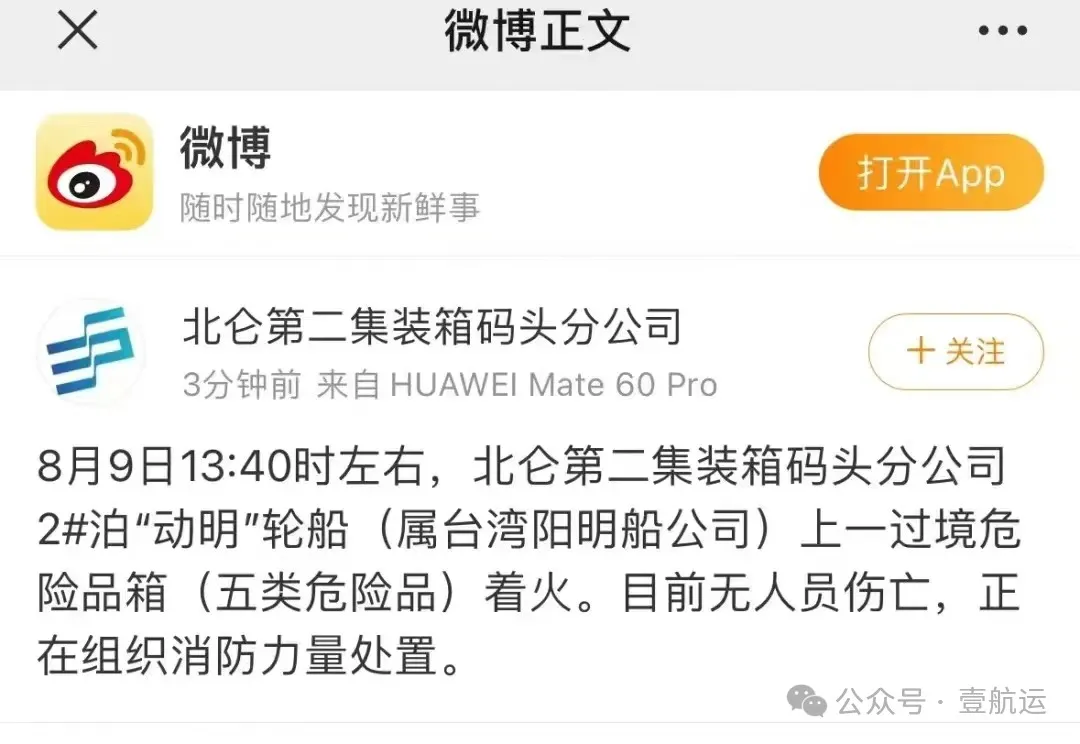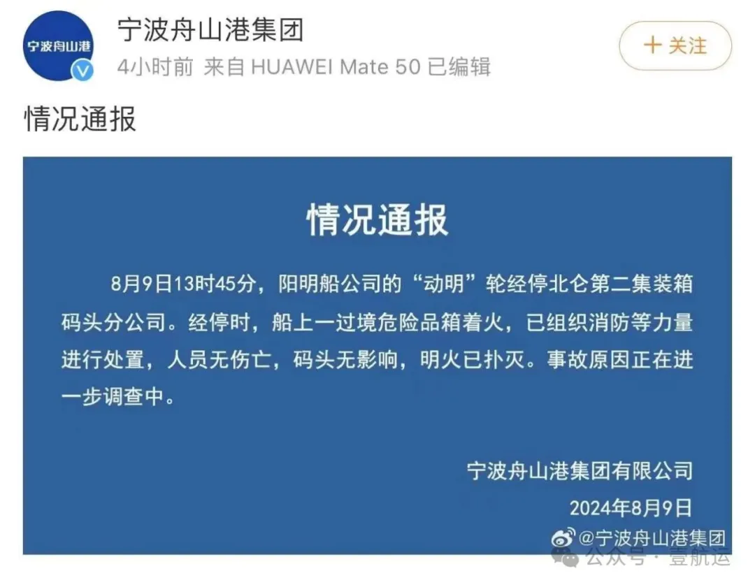 8月9日13时45分,阳明船公司的“动明”轮经停北仑第二集装箱码头分公司。经停时,船上一过境危险品箱着火,已组织消防等力量进行处置,人员无伤亡,码头无影响,明火已扑灭。