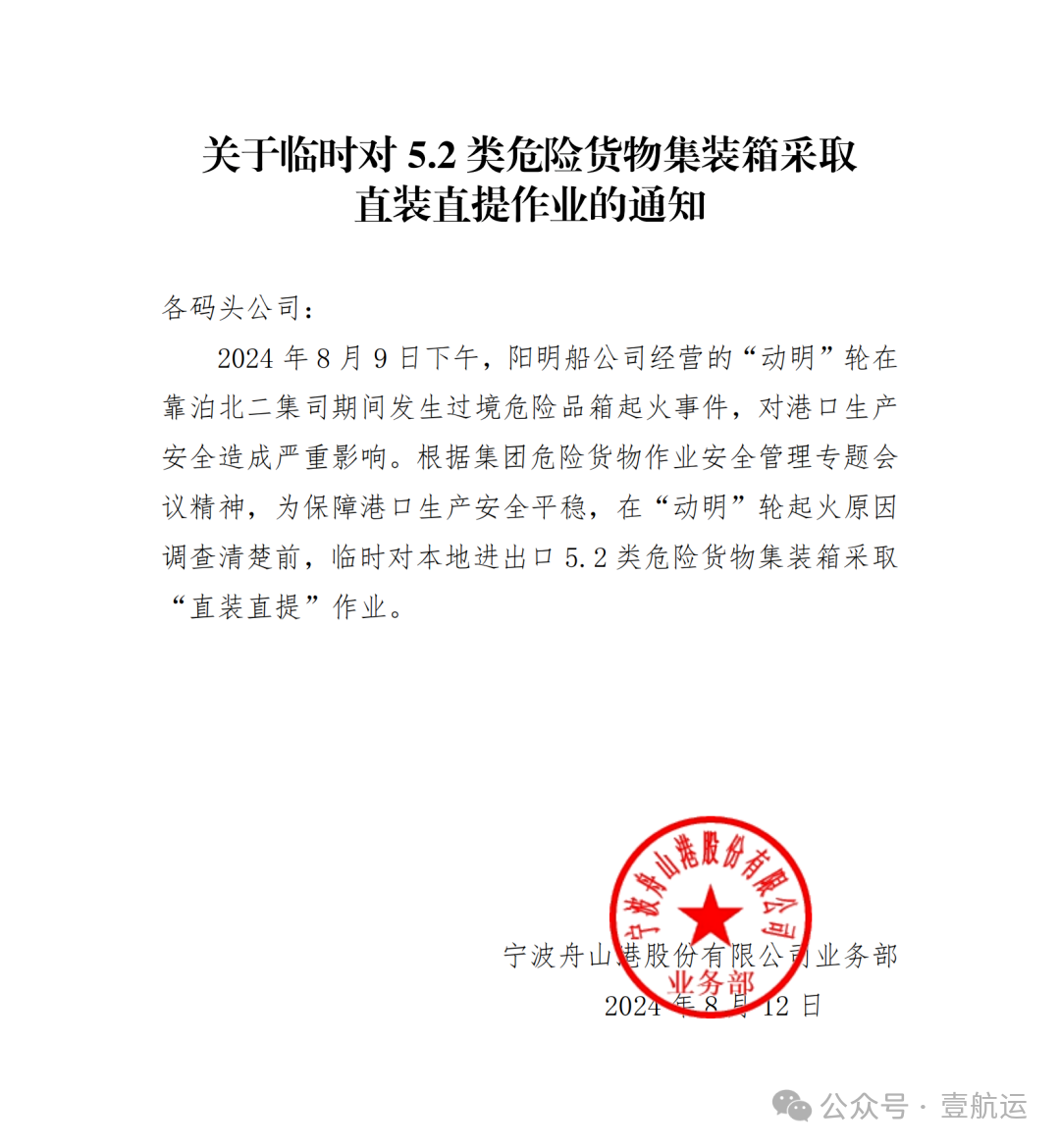 宁波舟山港官方通知要求: 在“动明”轮起火原因调查清楚前,临时对本地进出口5.2类危险货物集装箱采取“直装直提”作业。
