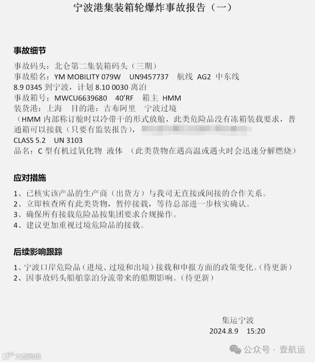 除上述来自宁波市海上搜救中心办公室、宁波港集团、北仑第二集装箱码头分公司以及阳明海运的官方情况说明外,一份由集运宁波发布的爆炸事故报告中,有揭露更多关于本次爆炸事故更多的细节:事故箱号:MWCU6639680,为一个40'RF, 箱主船公司为韩新海运HMM,