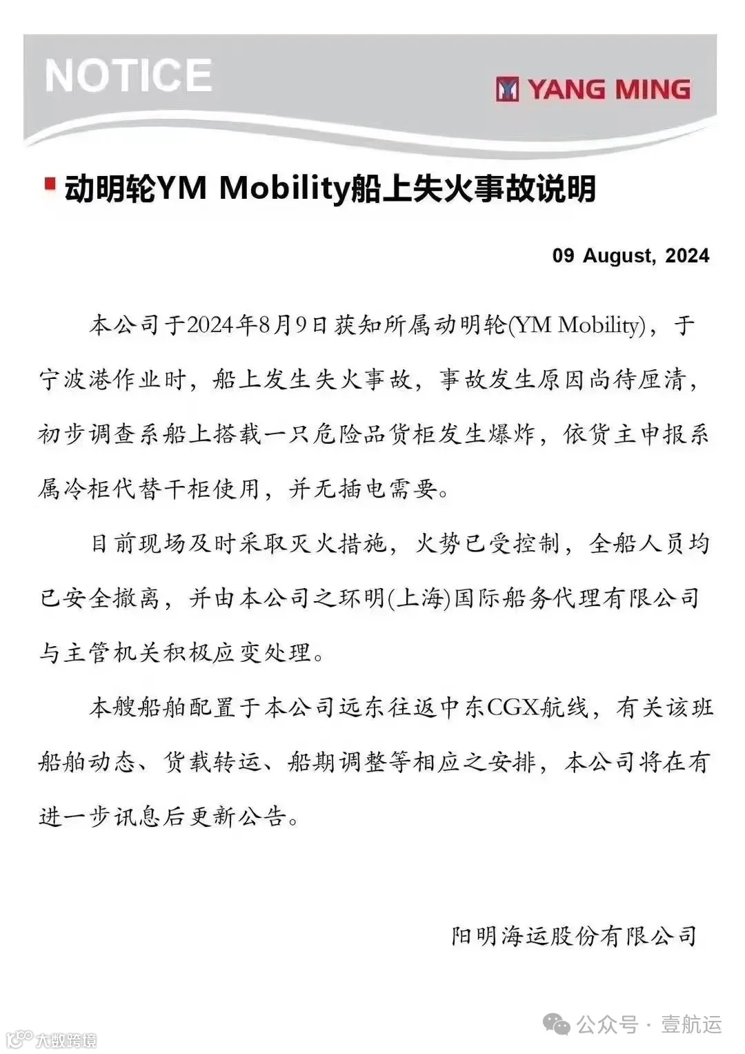 本公司于2024年8月9日获知所属动明轮(YM Mobility),于宁波港作业时,船上发生失火事故,事故发生原因尚待理清,初步调查系船上搭载一只危险品货柜发生爆炸,依货主申报系属冷柜代替乾柜使用,并无插电需要。