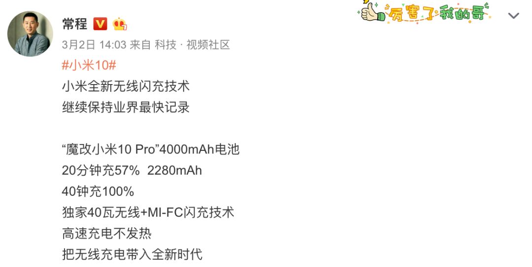 至于小米MIX 4的其他卖点,前些天常程晒的实验室40W无线闪充应该也能拿到首发,官方宣传其可实现20分钟充2280mAh即57%电量,40分钟可以充满4000mAh,同时不发热。MIX 4作为小米定位最高的旗舰系列,怎么着都不会少。慢慢等就是了~
