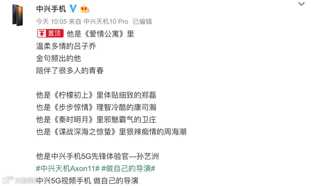 如上图所示,这位中兴手机 5G先锋体验官(体验官某种意义就是代言人)是演员孙艺洲,曾出演过 爱情公寓 里的 吕子乔。