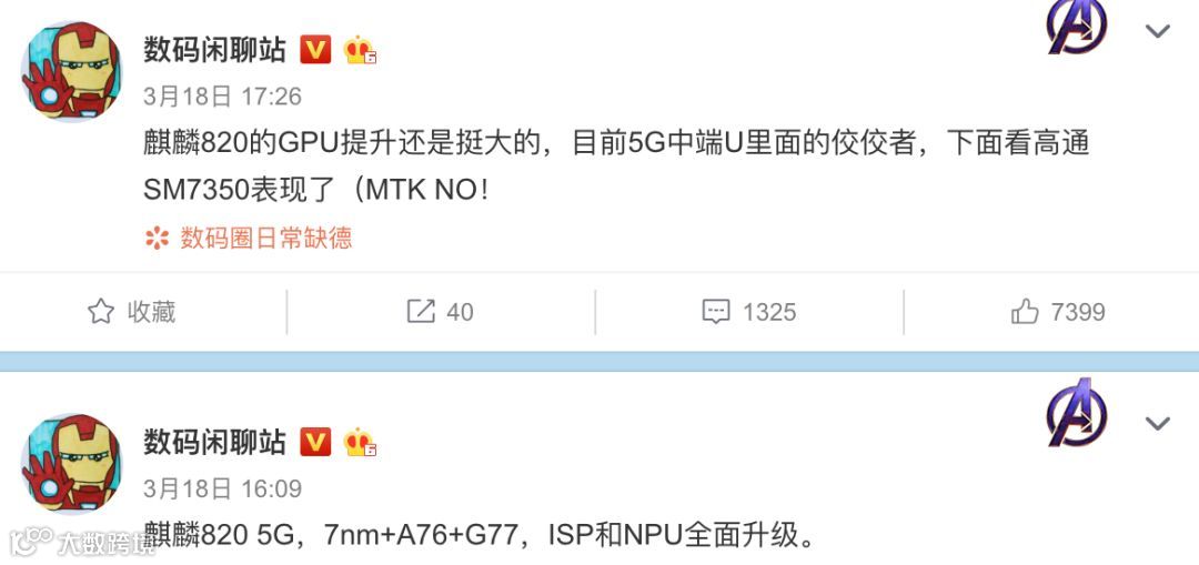 参数方面,据爆料,麒麟820 5G芯片将采用台积电7nm制程工艺,内部集成5G,CPU采用A76架构,GPU采用G77架构,ISP和NPU将全面升级。日常期待麒麟820中 或许还会预定中端5G最强U~