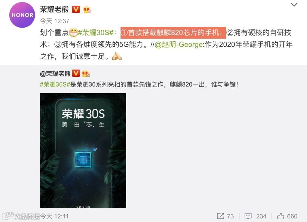 值得注意的是,上代麒麟810是由华为Nova 5首发,这次麒麟820交给荣耀30S首发,应该是因为Nova 7系列定位有所提高~爆料称Nova 7/Pro将搭载麒麟990 5G。