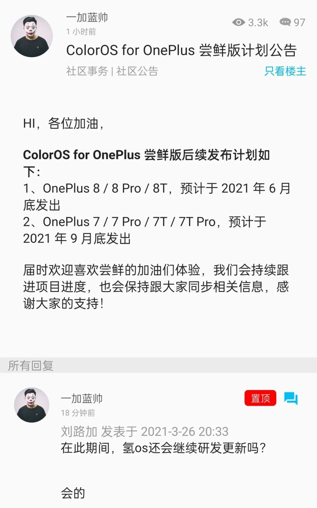 如上图所见,一加8 / 8 Pro / 8T:预计 2021 年 6 月底;一加 7 / 7 Pro / 7T / 7T Pro:预计2021 年 9 月底。