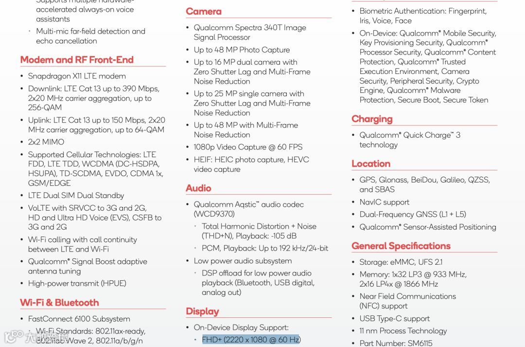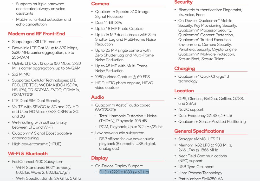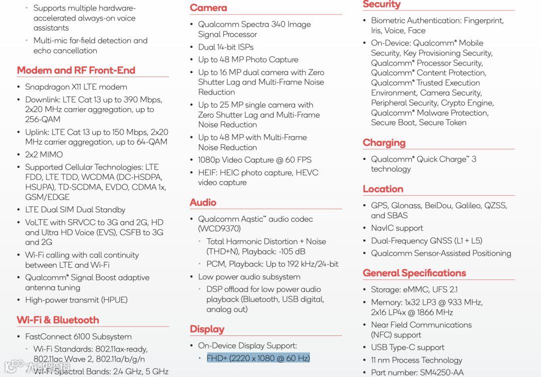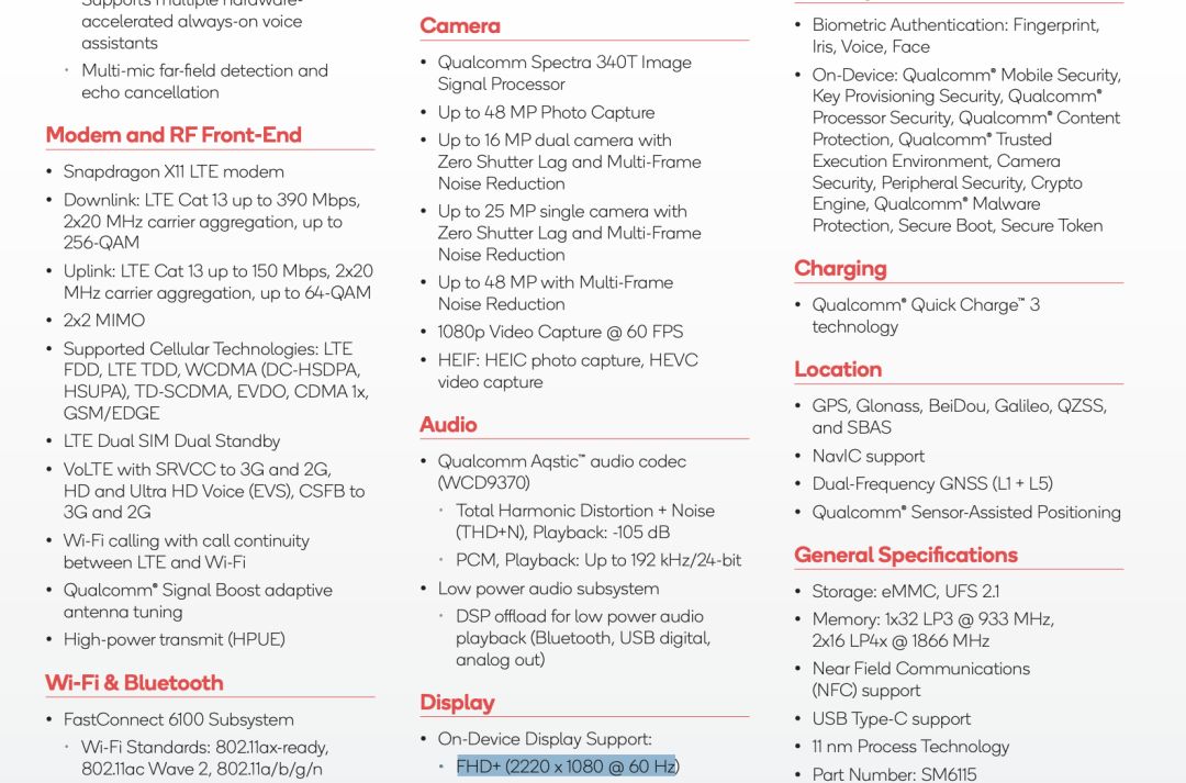 此外,骁龙662搭载全新骁龙X11 LTE调制解调器,双载波聚合、2x2 MIMO和256-QAM调制,可实现390 Mbps的下载速率和150 Mbps的上传速率,最高支持2220*1080屏幕分辨率和60Hz屏幕刷新率。