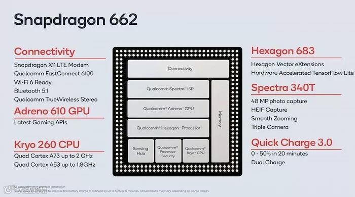 值得一提的是,骁龙662使用了全新的Qualcomm Spectra 340T ISP(单摄最高支持48MP),并是骁龙6系首款支持三摄及平滑变焦的SoC,支持HEIF照片格式,以一半的文件大小存储高品质图像等。