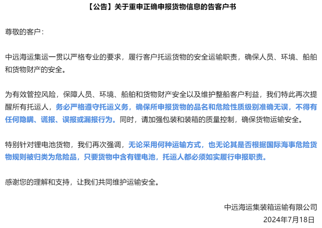 此前,中远等多家船公司提醒只要货物中含有锂电池,必须如实申报: