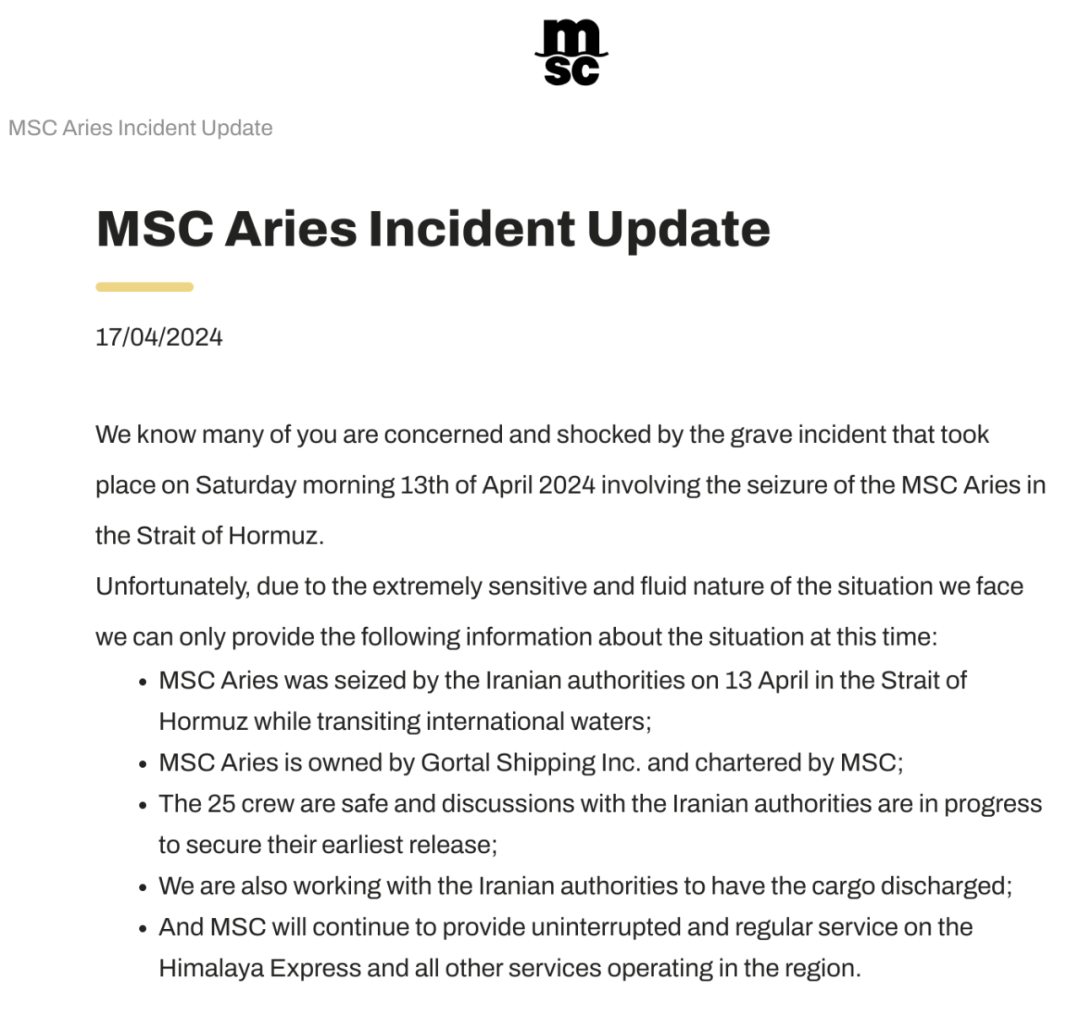 4月17日,地中海航运(MSC)在官网发布“MSC Aries”轮扣押事件公告。