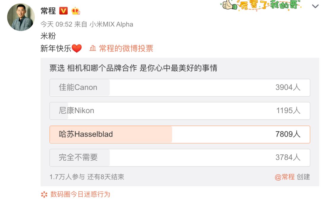 小米副总裁在微博发起了你希望小米手机相机和哪个品牌合作的相关投票调查,选项有佳能、尼康、哈苏等,网友们期待小米手机和哈苏相机联名合作的意愿最多,