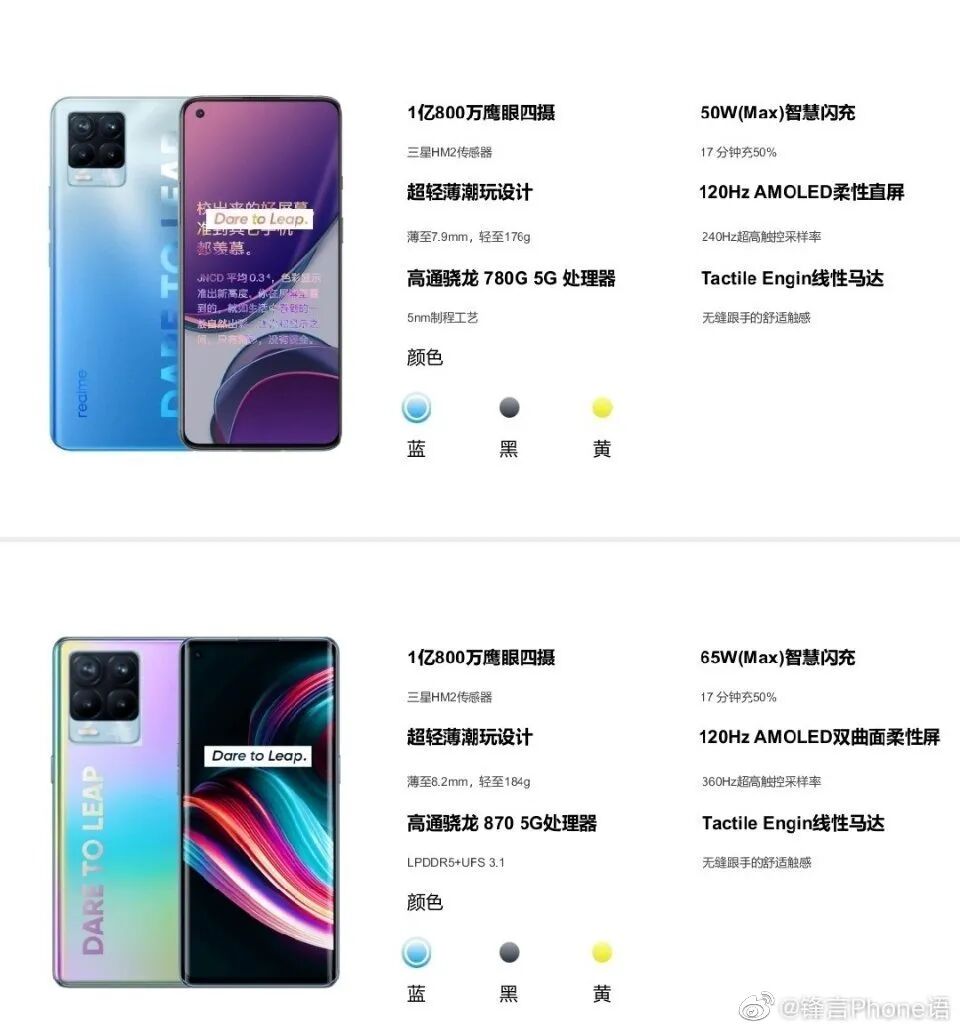 爆料图称,realme两款新机均主打1亿800万像素鹰眼四摄,主摄为三星HM2传感器,其中一款采用骁龙780G处理器+120Hz AMOLED柔性直屏+50W闪充,另一款则采用高通骁龙870处理器+120Hz AMOLED双曲面屏+65W闪充。或许是realme真我X9系列?🤔(X7系列的迭代?🤔) 现在就等官宣了。