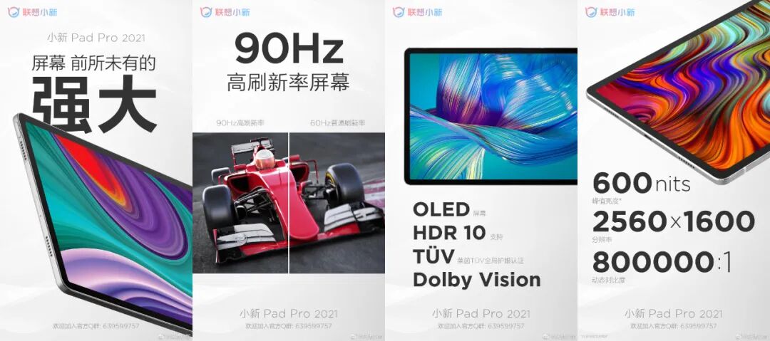据联想小新官方预热称,小新Pad Pro 2021将采用一块2.5K分辨率(2560*1600)、90Hz屏幕刷新率、峰值亮度600nits、支持HDR10的OLED全面屏。