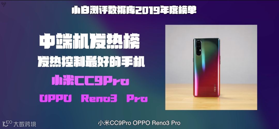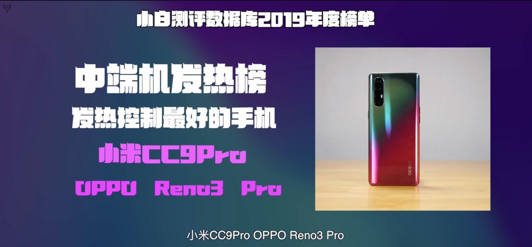 第八则是小白测评数据库2019年度游戏发热榜单,此处我们分两个榜单,中端机型发热排行榜中,OPPO Reno3Pro和小米CC9Pro位居榜首,连续一小时和平精英默认画质机身最高温度40.1℃,表现不错,第二名是荣耀9X,虽然没有夜冷散热,但麒麟810本身温控做的的非常好,41.7℃的机身温度也不算高,第三名是vivo X27,最高41.9℃。