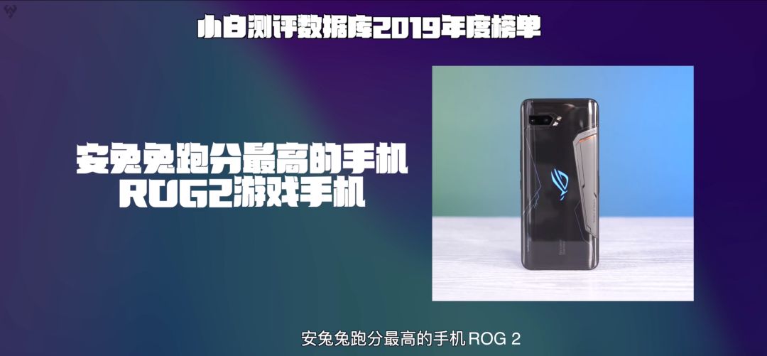 小白测评数据库2019年度跑分榜,分为几个小榜单,依次是安兔兔跑分最高的手机-ROG2游戏手,得分513949。