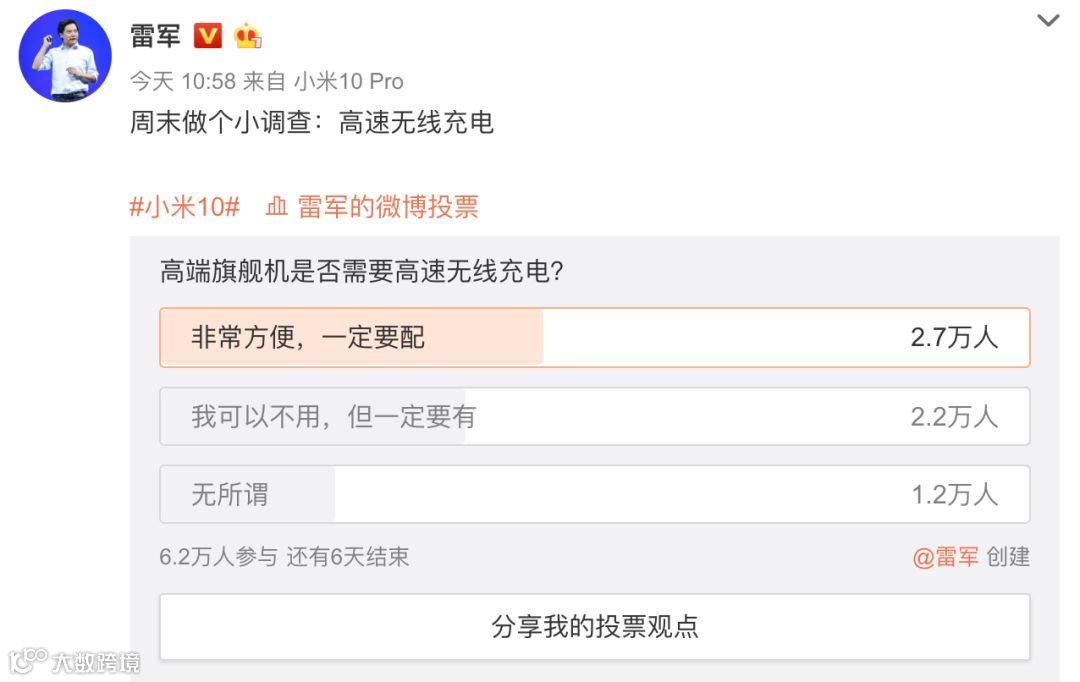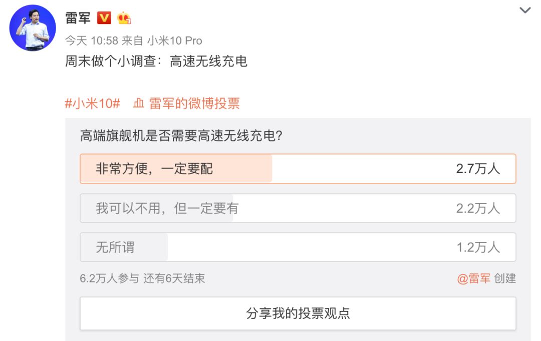 如上图所示,雷军发起投票“高端旗舰机是否需要高速无线充电?” 实则宣传自家小米10系列配备了30W无线闪充,支持10W无线反向充电。