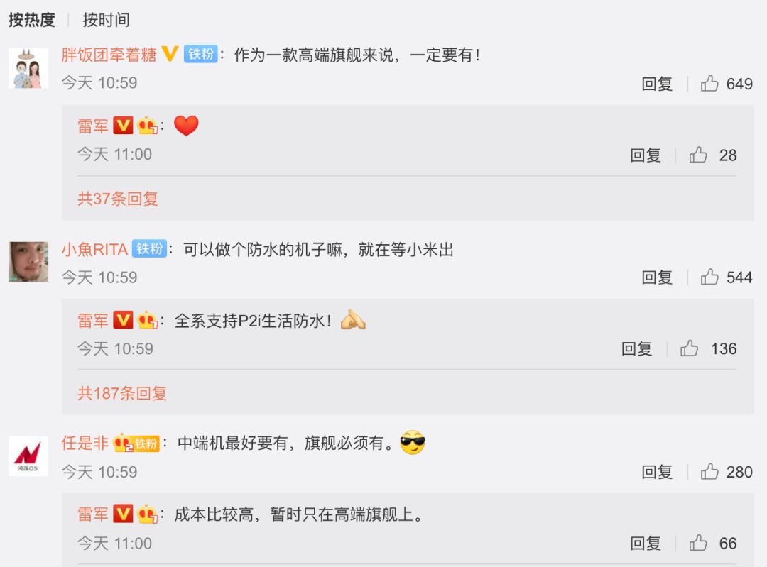 网友们也纷纷评价 一定要有、可以不用但得有 等。至于没上IP68防尘防水,雷军则回应全系支持P2i生活防水。