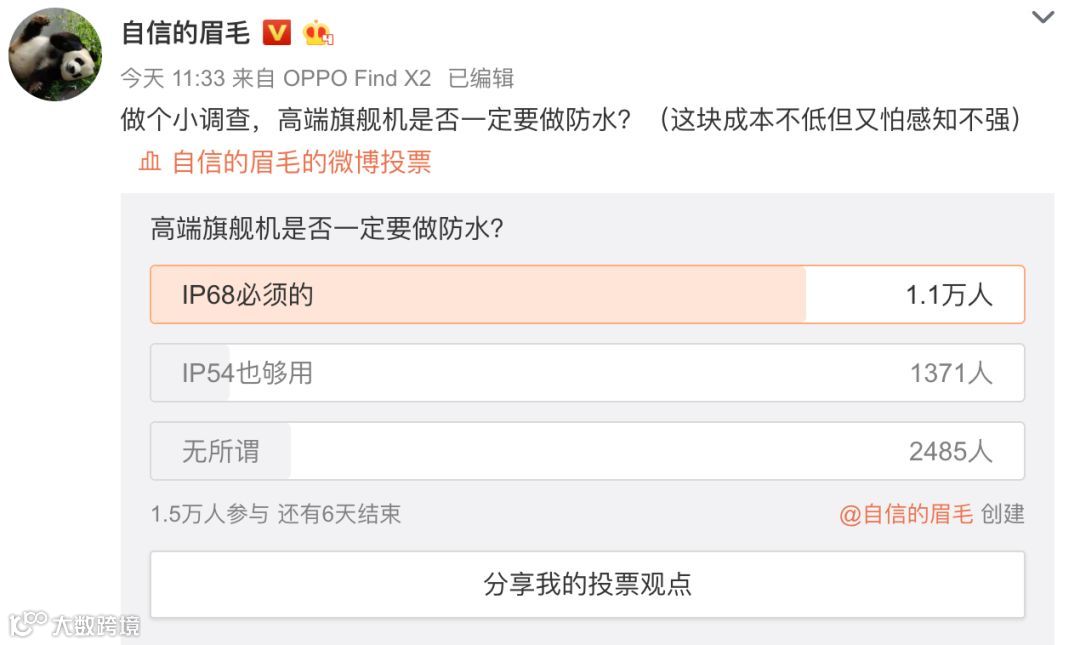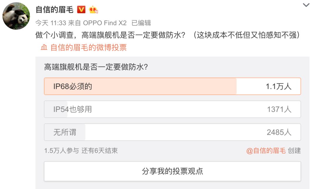 与此同时,隔壁OPPO副总裁也发起了投票“高端旗舰机是否一定要做防水?” 实则宣传自家OPPO Find X2系列配备的IP54级和IP68级防尘防水。