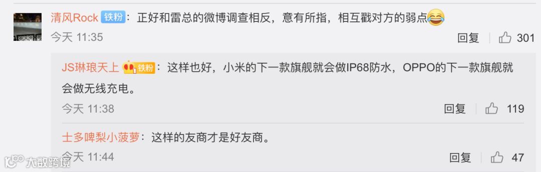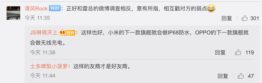 看到两家高管差不多同一时间发起相反主题的投票,不少网友均表示这样不提友商名字的营销还不错,可以督促彼此下一款旗舰补足遗憾,不知道大家怎么看呢?