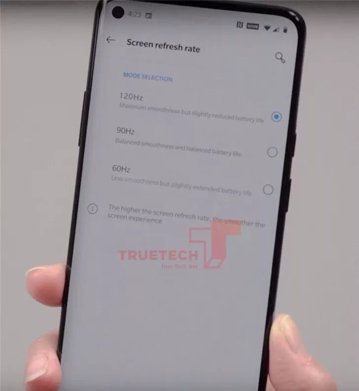 谍照显示,疑一加8 Pro提供60Hz、90Hz、120Hz三个调节选项,同时采用1块单挖孔曲面屏,机身按键无侧边指纹按键,预计是OLED屏+屏幕指纹的组合,细节上一加8 Pro左上角的单挖孔直径相比OPPO Reno 3 Pro略大。