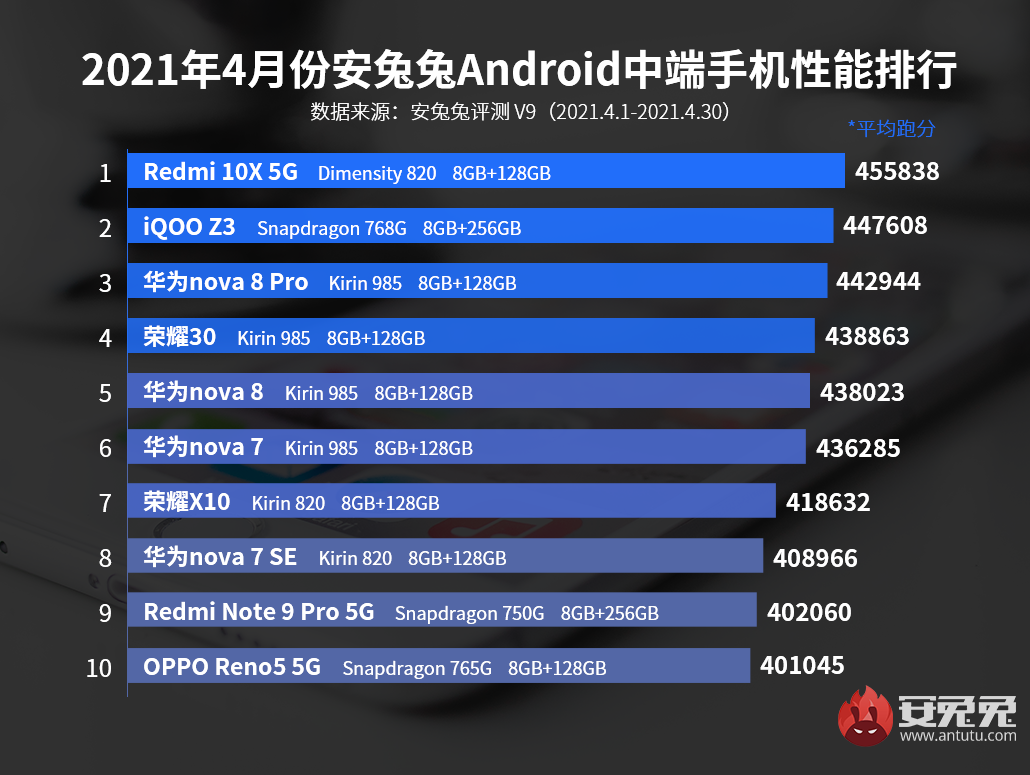 2021年4月份Android中高端手机性能榜单