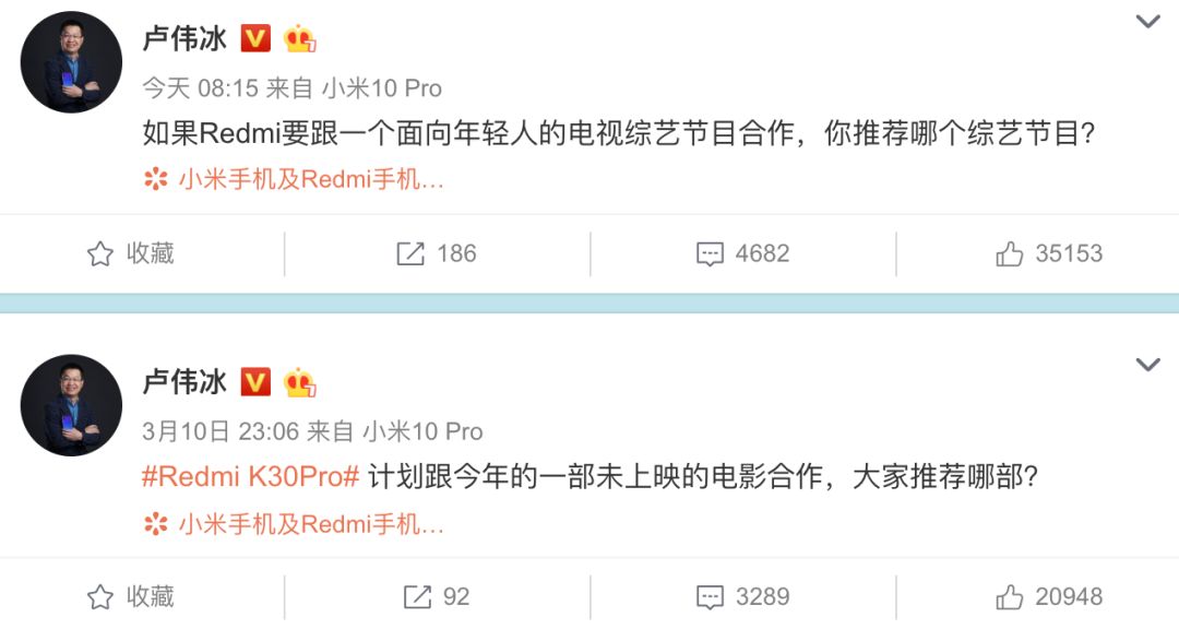 Redmi这边,卢伟冰也预热了一件说大不大说小不小的事情,那就是——Redmi将冠名赞助一些电影和电视综艺节目。