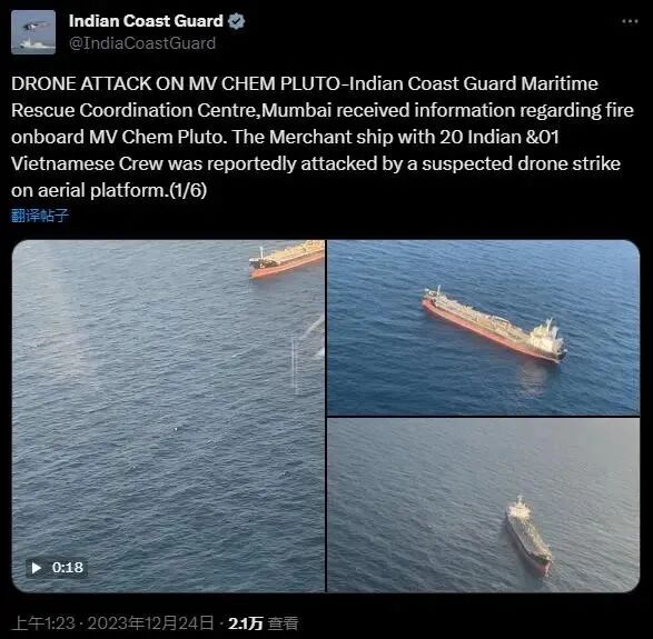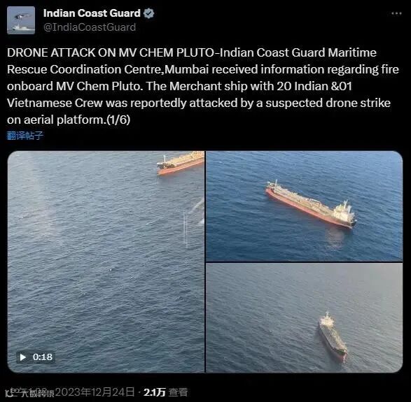 这是近期发生的第二起同类事件。上周六,一艘沙特驶向印度港口的以色列油轮MT “Chem Pluto”轮在印度西海岸遭遇无人机袭击,引发火灾,船上的20名印度船员及1名越南船员均无伤亡。