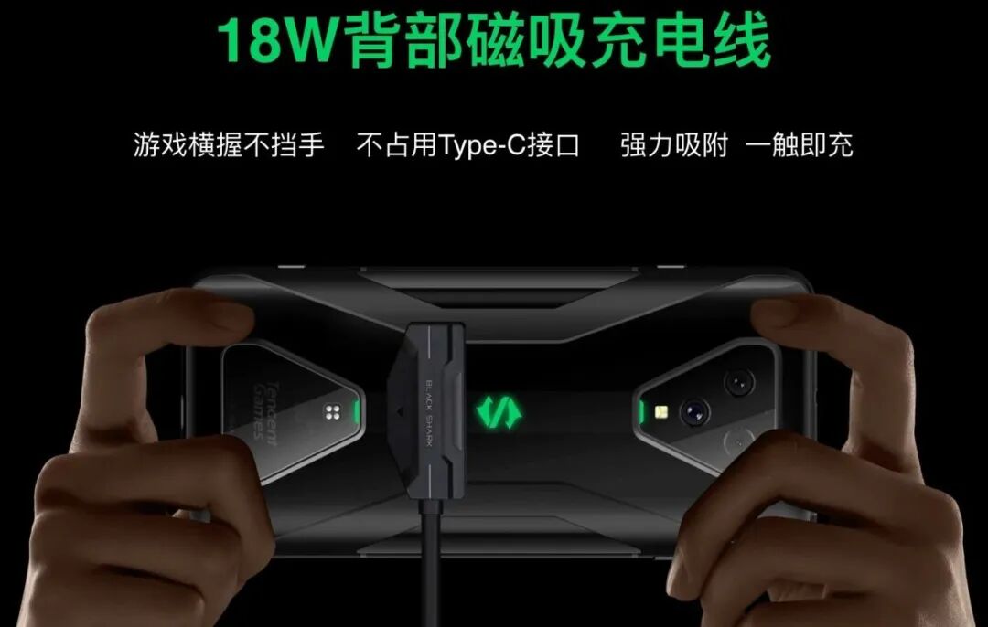 细节上,黑鲨3系列背部上下是两个三角形,上面那块是后置摄像头,下面那块三角形是背部磁吸模块+腾讯和5G的logo,支持磁吸充电(配图的18W磁吸充电线需另购,售价79元。)