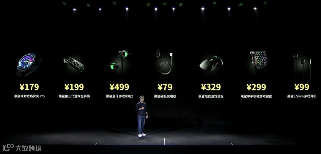 最后是价格,首先是配件:黑鲨蓝牙游戏耳机2 售价499元(主打行业最低延迟58ms);黑鲨冰封散热背夹Pro 售价179元(支持在25℃环温下1分钟让手机速降14℃);黑鲨第三代游戏左手柄 售价 199 元;磁吸18W充电线 79 元等等。