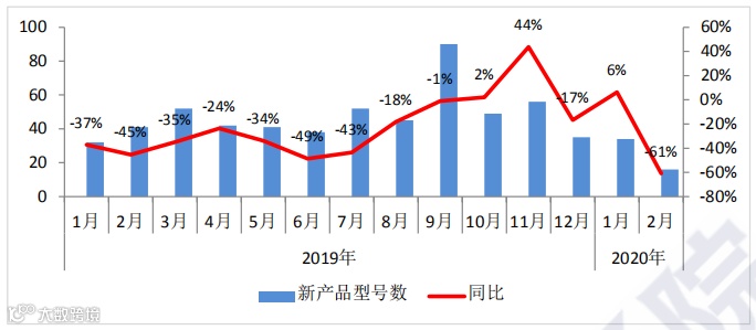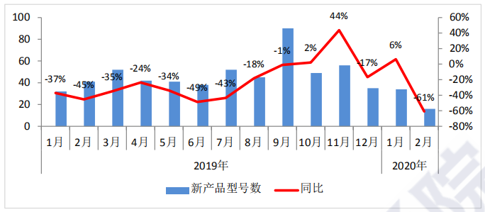 具体到机型数量上,2020年2月,上市新机型16款,其中4G手机4款、5G手机11款。报道还称这些新机型中智能手机的数量为14款,同比下降61.1%,占同期手机上市新机型数量的87.5%,均为Android手机。