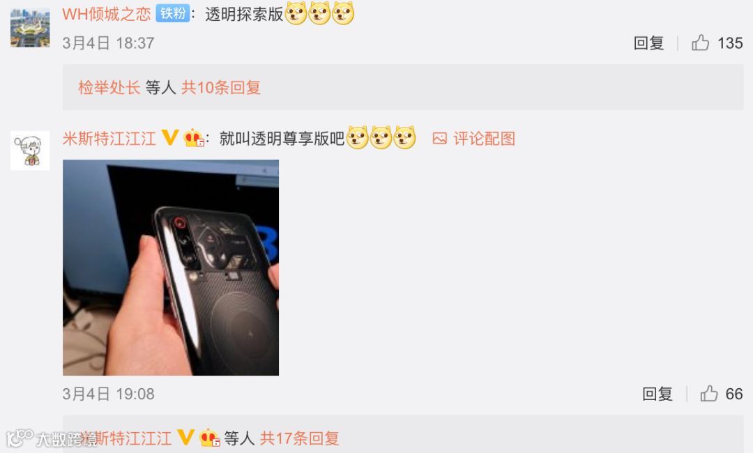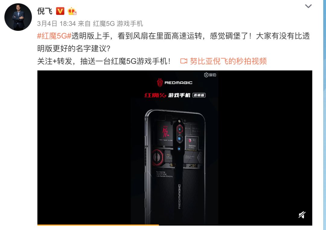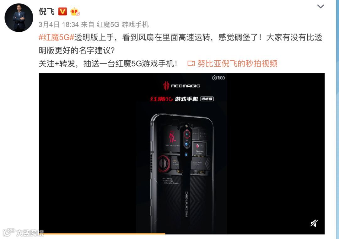 另一边,预热将于3月12日正式发布的红魔5G游戏手机也已经开始上架预约,高管晒出了透明版,号召大家给起个名字。