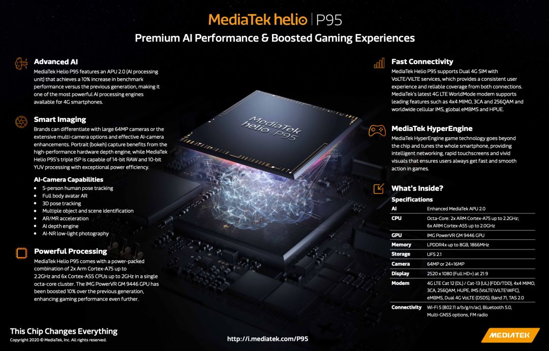 此外,联发科P95 最高支持8GB LPDDR4x内存和UFS 2.1闪存,支持最高6400万像素,2520x1080分辨率屏幕,支持 LTE Cat.12 和 WiFi 5等等。不过暂时没有预告何时量产和合作厂商,不出意外的话OV的中低端系列应该会搭载。